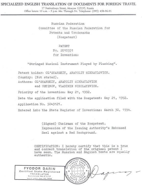 David Schramm was the first American guitar builder authorized to build this patented guitar. He is North America's leading authority regarding this instrument. Mr.Schramm decided to create a special web page to honor his dear friends Vladimir Ustinov and Anatoliy Olshanskiy, inventors of the G.R.A.N. Guitar to whom this web page is dedicated. You will find special photos documenting the history of the instrument in the USA as well as other interesting information about this instrument.