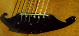 | The heart of the Gran is the unique bridge design. There are two sets of six strings. A standard nylon set along with custom gauge steel strings next to and below the nylon strings. | |