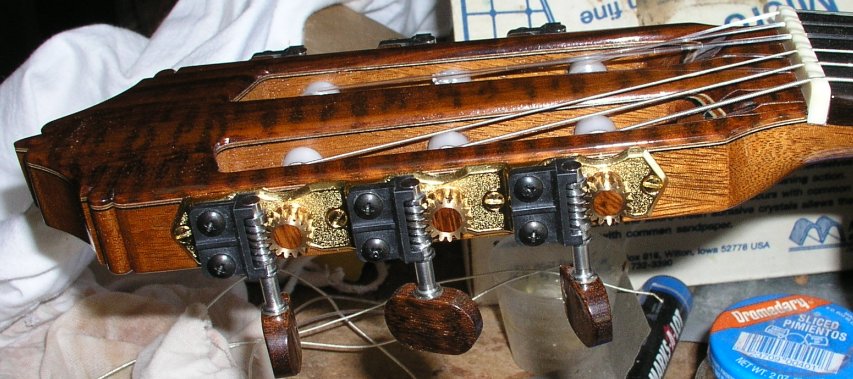 | Head with snakewood headplate and Gilbert tuners with snakewood gear dots and knobs. | |