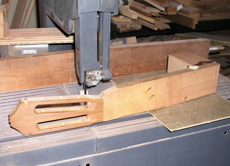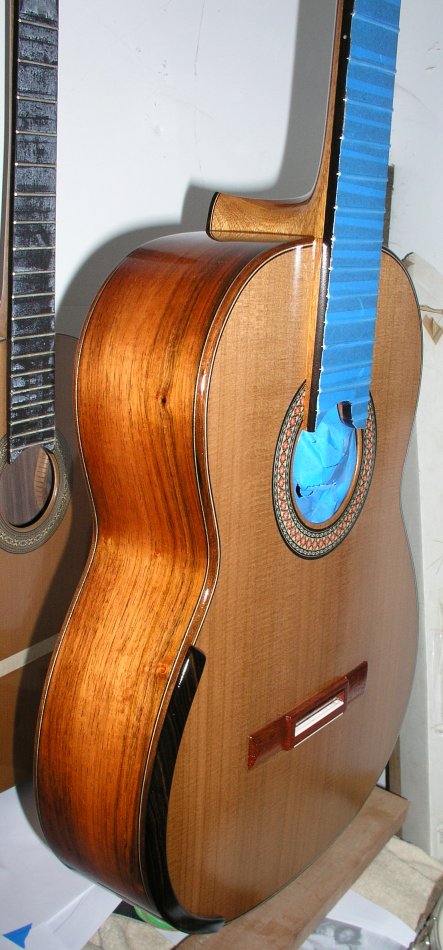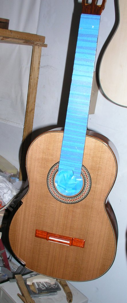 | Elevated neck, fretted and ready for the bridge and final sanding prior to finishing. | |
